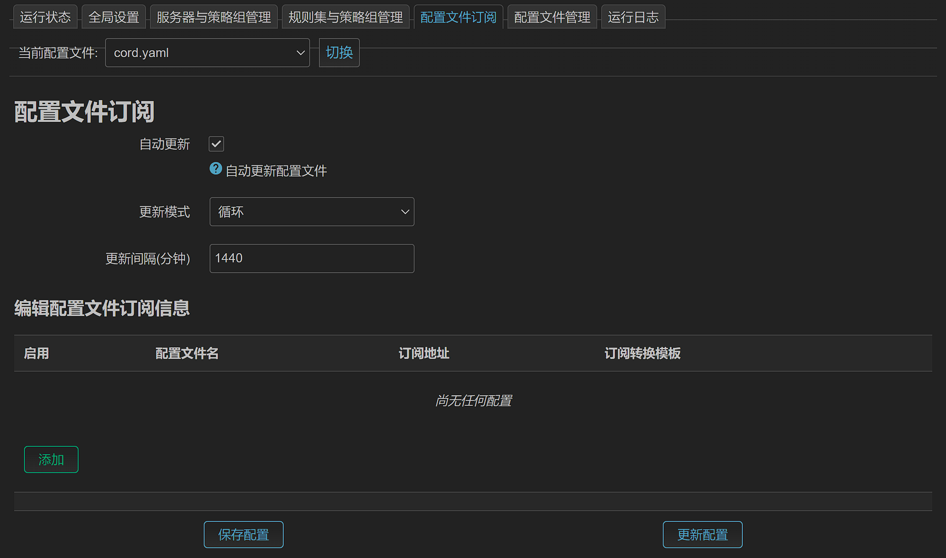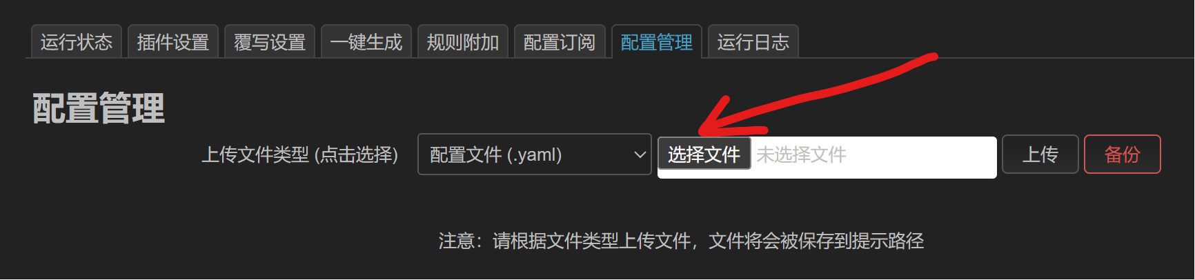 配置管理手动选择文件上传即可(通过导入的本地文件能够联通外网后记得再去添加订阅,避免因时间流逝配置文件过时)